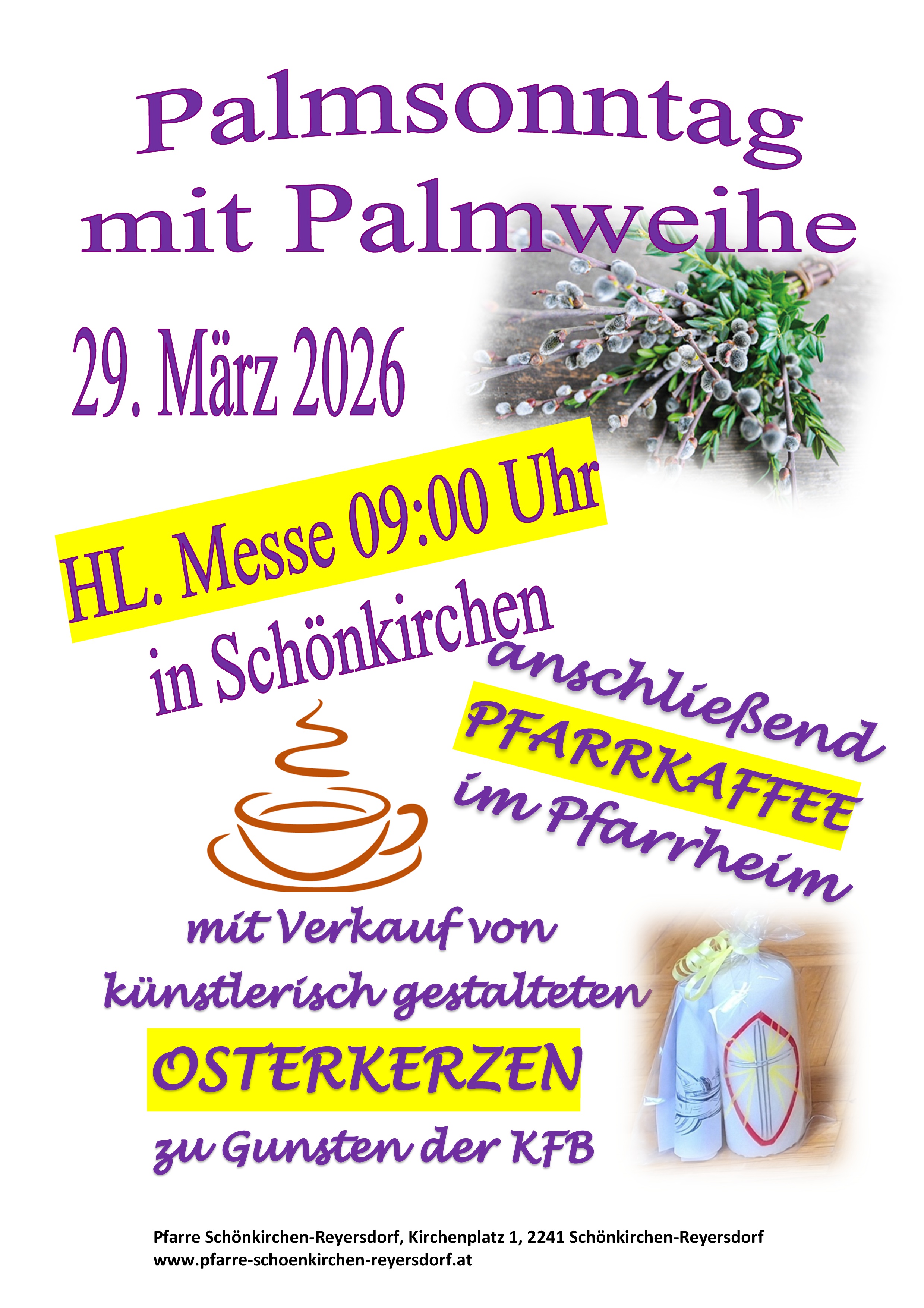 Palmweihe bei der Dreifaltigkeitssäule - Heilige Messe in der Pfarrkirche - Pfarrkaffee im Pfarrheim und Verkauf von gesegneten Osterkerzen zu Gunsten der Katholischen Frauenbewegung